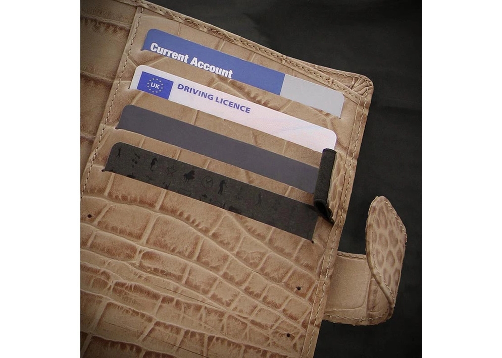 - met een uitbreidbare pennenlus, een verticaal opbergvak, creditcardvakken en een kladblok-sleuf