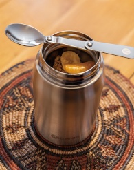 - voorzien van 2 afsluitbare doppen; in de binnendop zit een opvouwbare lepel van 100% RVS