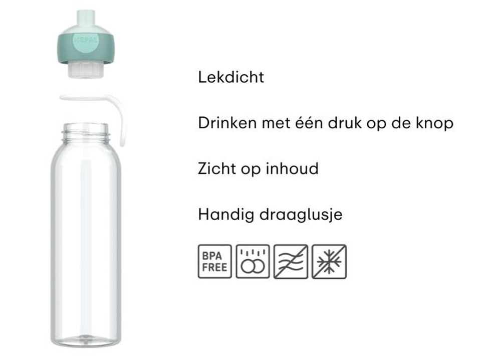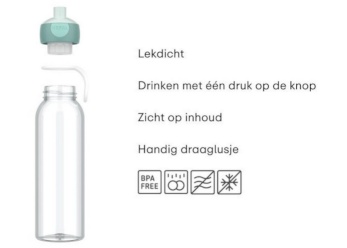 - de dop van de waterfles is voorzien van het pop-up drinksysteem, je opent de fles dus met één simpele druk op de knop