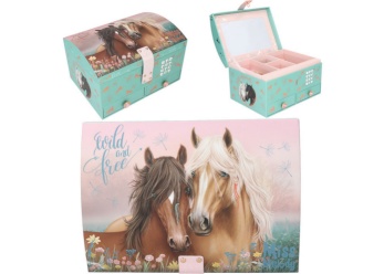 - aan de buitenkant in lichtgroen, binnenin roze en overal met paarden en leuke figuurtjes