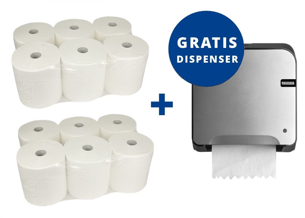2 x 6 rollen handdoekpapier + gratis handdoekdispenser Pandava zilver