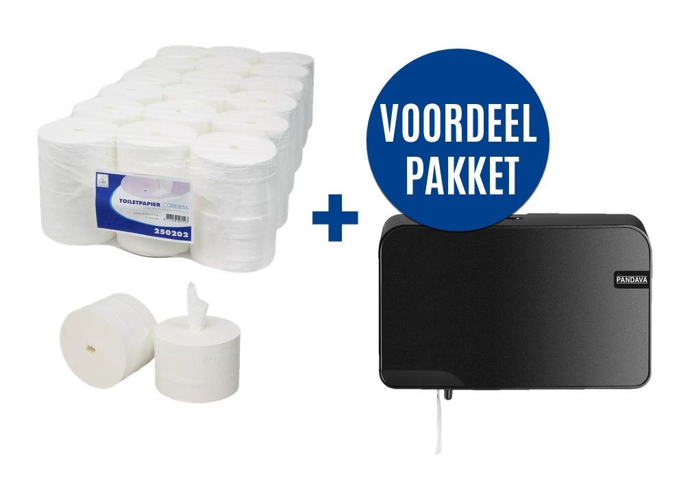 Profiteer van dit complete voordeelpakket : 36 hulsloze rollen toiletpapier + een Pandava duo toiletpapier dispenser voor de beste prijs!