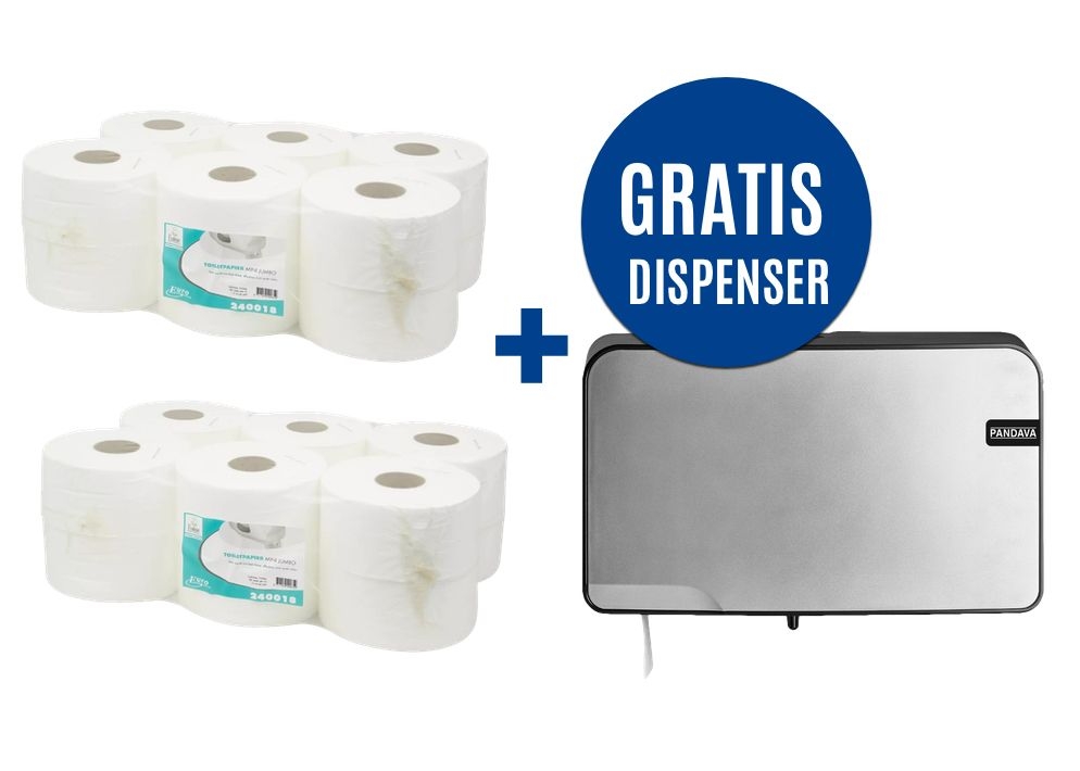 2 x 12 mini jumbo rollen toiletpapier + gratis duo dispenser Pandava zilver