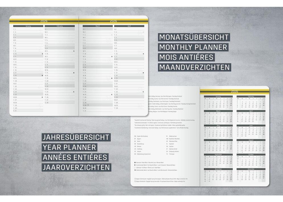 - bevat maand- en jaaroverzichten, feestdagen en schoolvakanties (DE/AT/CH/UK/FR/BE/NL), gelinieerde notitiepagina’s