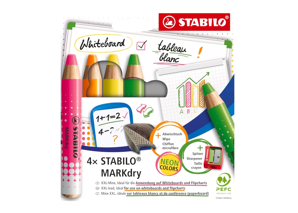 4 whiteboard potloden in etui Stabilo MarkDry neonkleuren