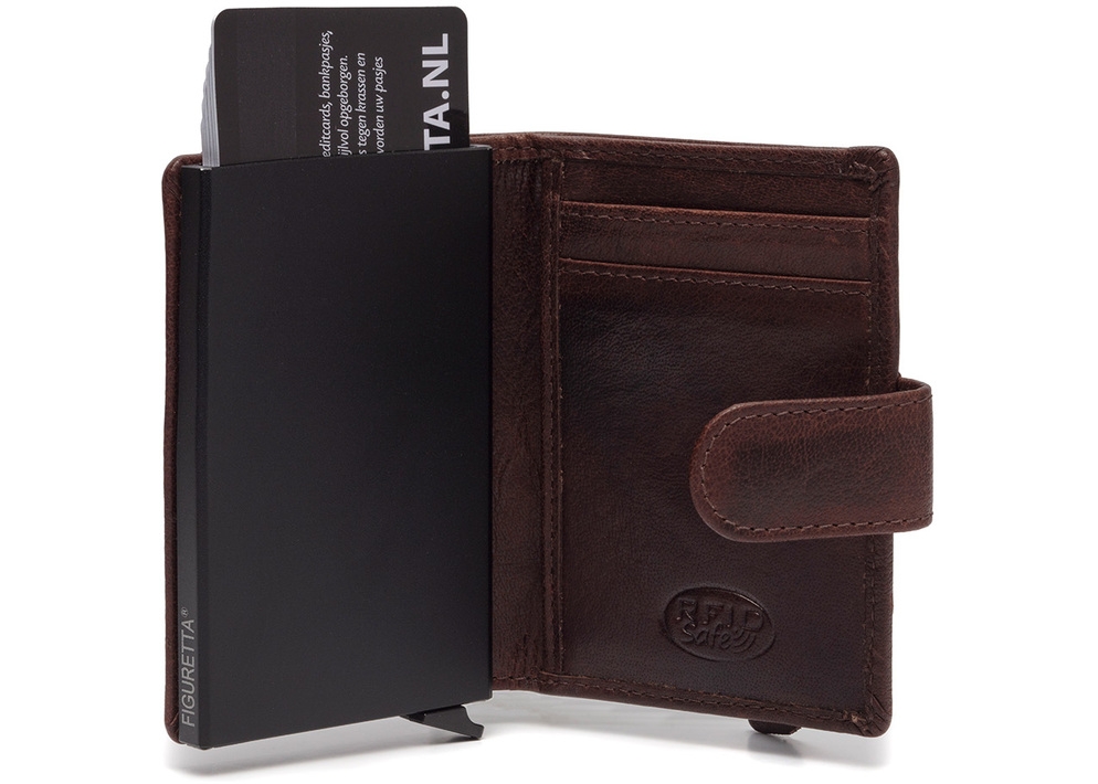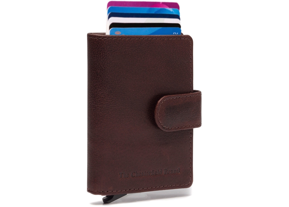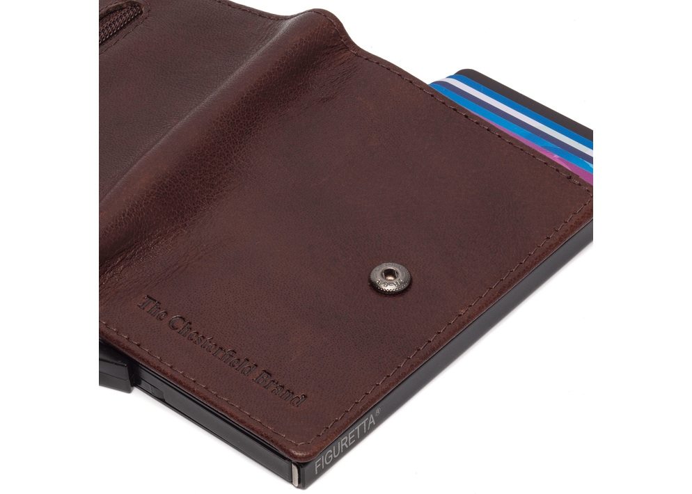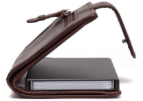 - is voorzien van een leren hoes met drukknoopsluiting waarin je zowel pasjes als briefgeld kunt bewaren