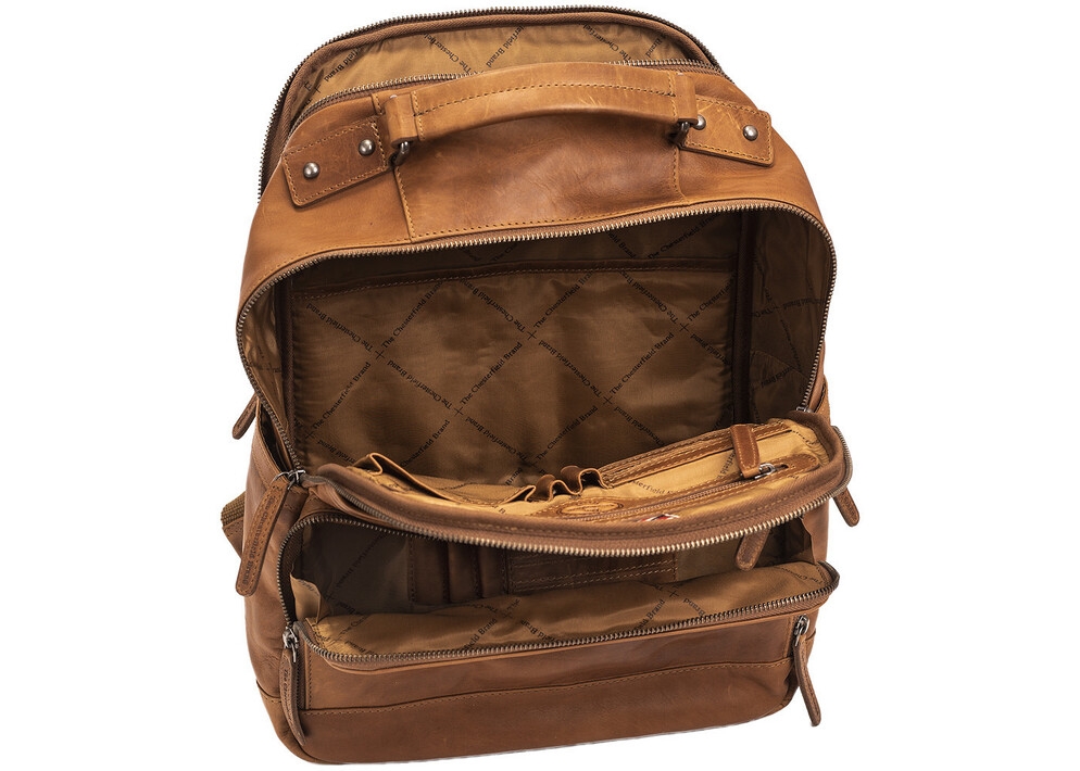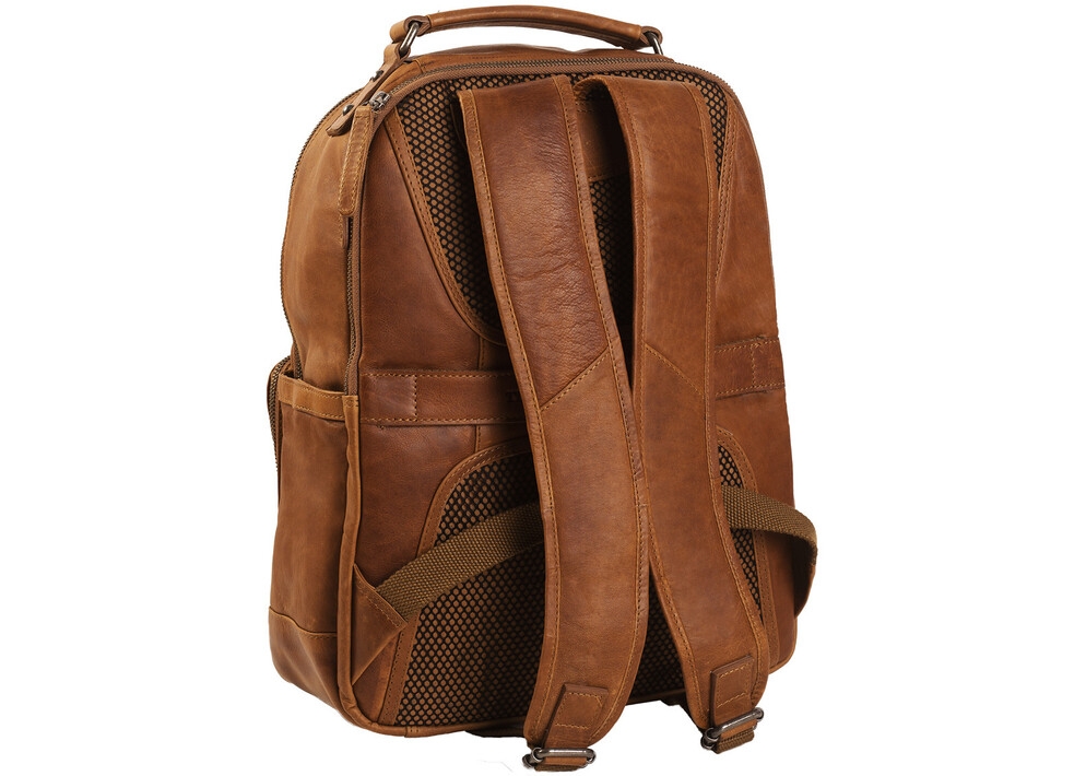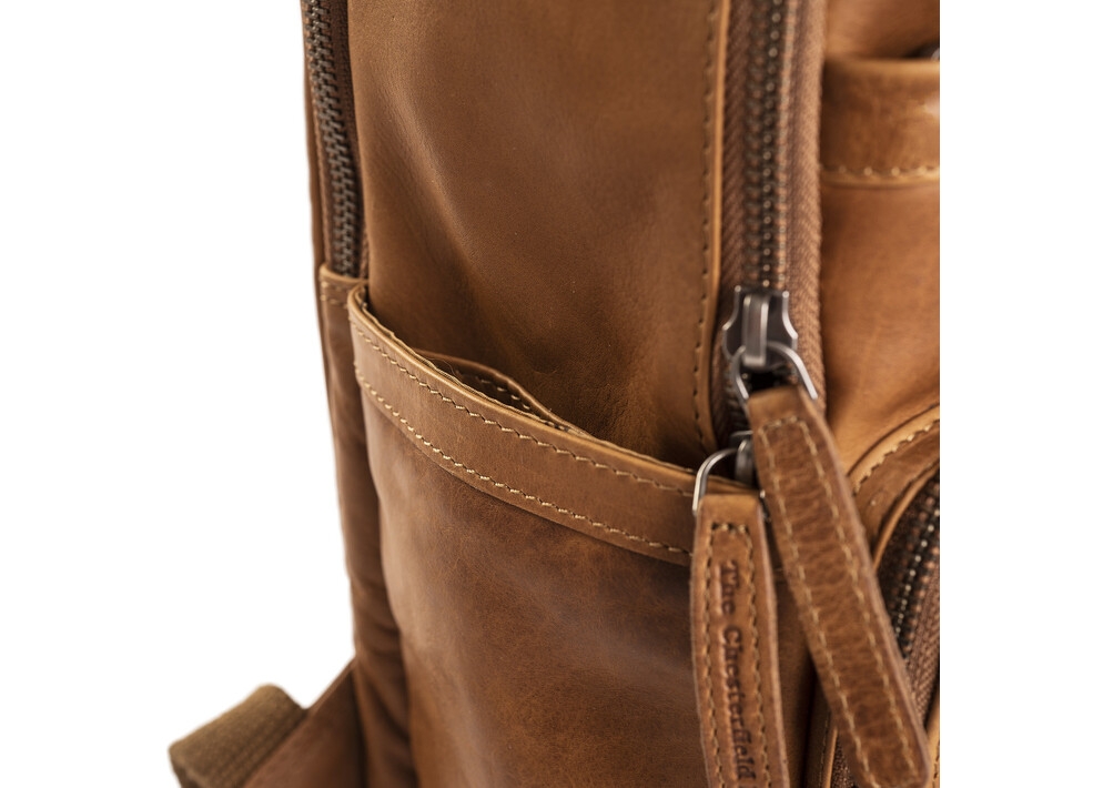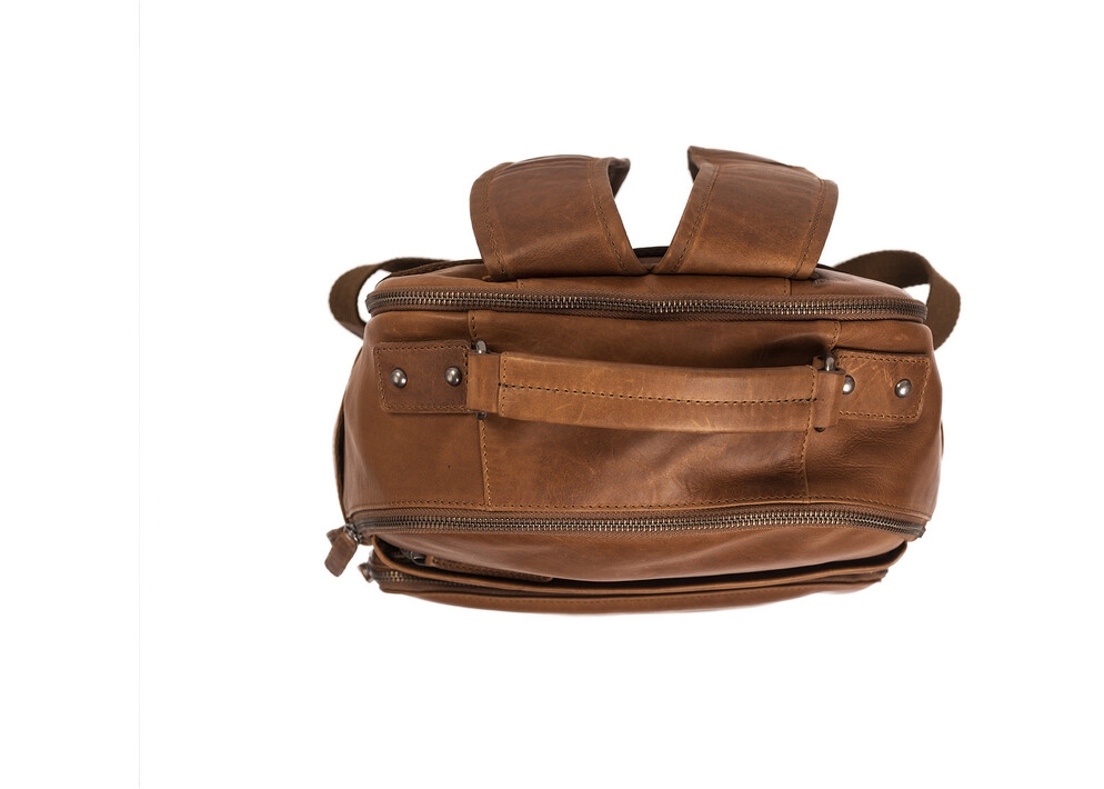 - verder is deze leren rugzak voorzien van drie extra opbergvakken, een houder voor een drinkfles en een trolleyband