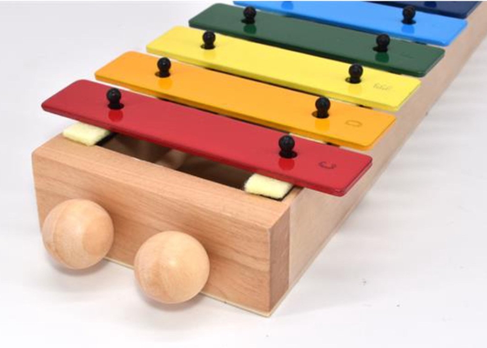 - houten xylofoon met 8 hoogwaardige metalen klankstaven en 2 houten stokken