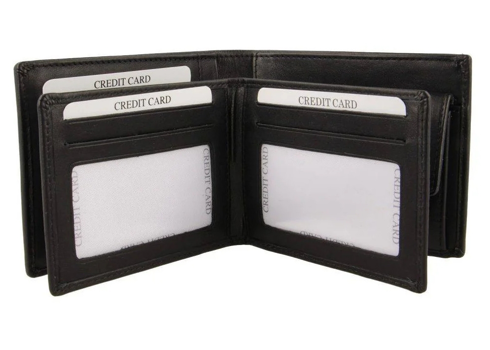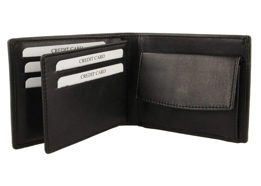 - tevens heeft deze portefeuille 5 open zijvakjes, 2 vakken voor bankbiljetten en een muntvakje met drukknop